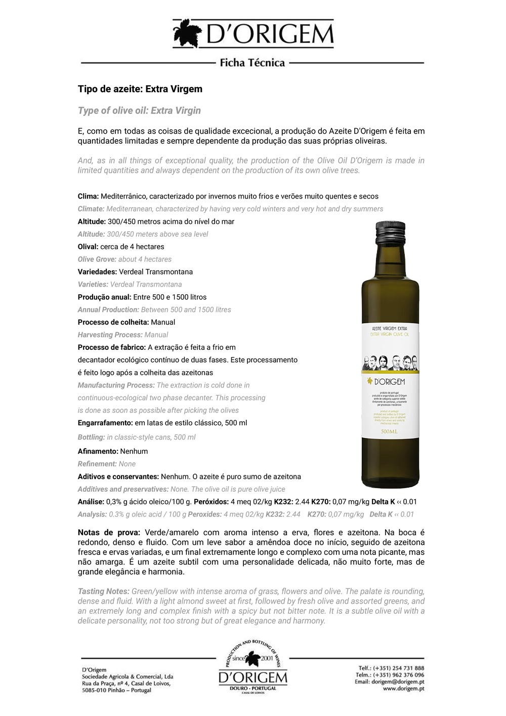 Processo de Fabrico: A extracção é feita a frio em continuo-decanter ecológico de duas fases. Este processamento é feito o mais rápido possível após a apanha da azeitona.